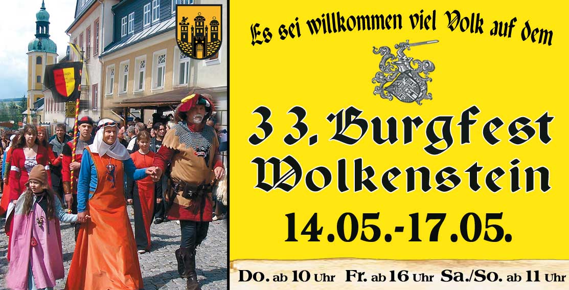 Hiermit wird kund und zu wissen getan, dass am 14. Mai dieses Jahres zu Christi Himmelfahrt und den drei Tagen hernach für das Volk zu Wolkenstein und seine Gäste zum 33. Burgfest ein gar mittelalterliches Spektakulum stattfindet.